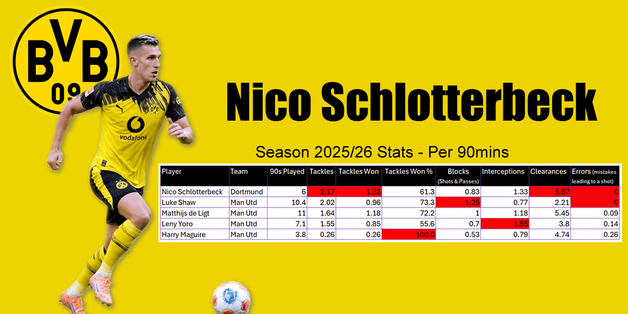Another stat to consider is that in Tackles Made per 90 Mins, Schlotterbeck ranks 22nd in Bundesliga for Defenders who have played a total of 360 mins or more this season. That does not exactly put him in the top echelon of Bundesliga Defenders