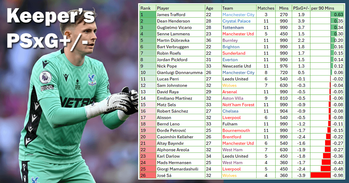 The PSxG+/- per 90 mins is the better guide because this averages form out over games played. Only Keepers who have played a minimum of 270 mins this season are included.